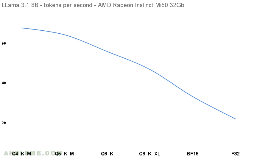 This article shows the GPU-only inference with a relatively old GPU from 2018 year – AMD Radeon Instinct Mi50 32Gb. For the LLM model Meta LLama 3.1 8B meta-llama/Llama-3.1-8B with different quantization are used to show the difference in token generation per second and memory consumption. LLama 8B is a small dense LLM model, which is primary used for text summarization and benchmark tests, because it has good results for the memory footprint it has and the tokens generation speed. It is published by the Meta giant, and in many cases it can be considered to offload some LLM work locally for free. The article is focused only showing the benchmark of the LLM tokens generations per second and there are other papers on the quality of the output for the different quantized version. Due to the small memory footprint it is used in many GPU benchmark tests with low RAM memory. More llama-bench here.