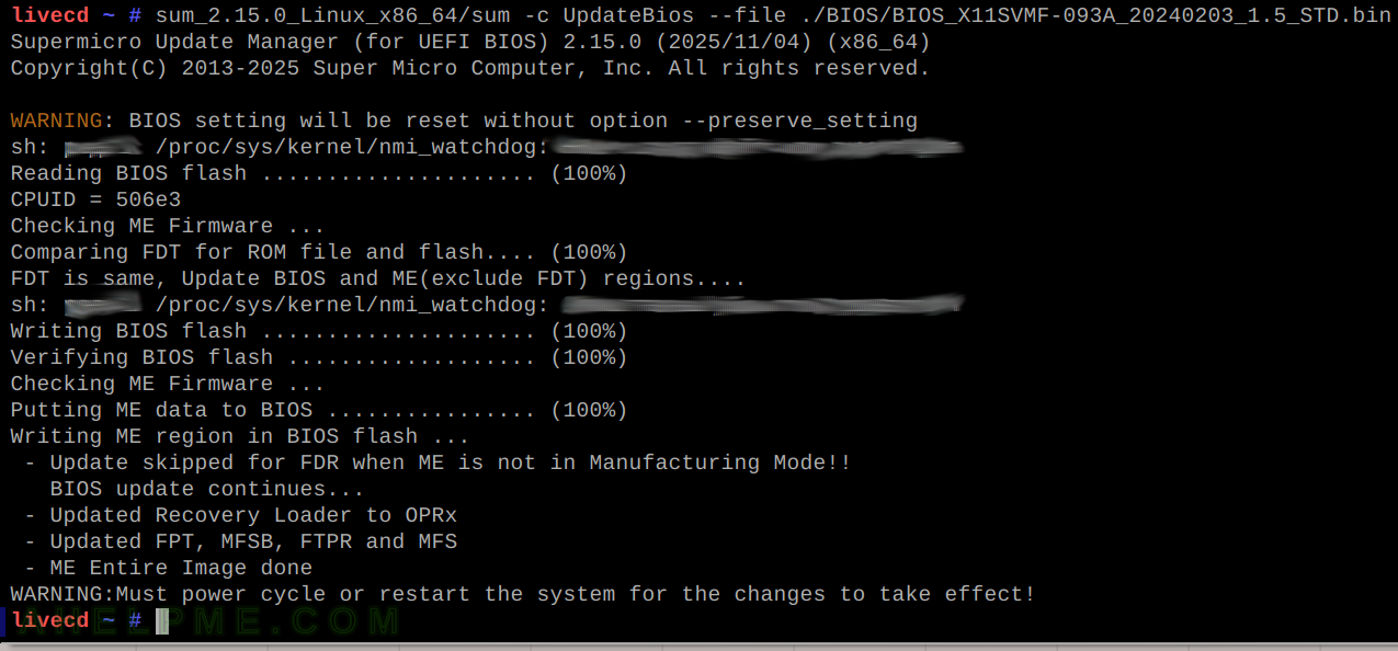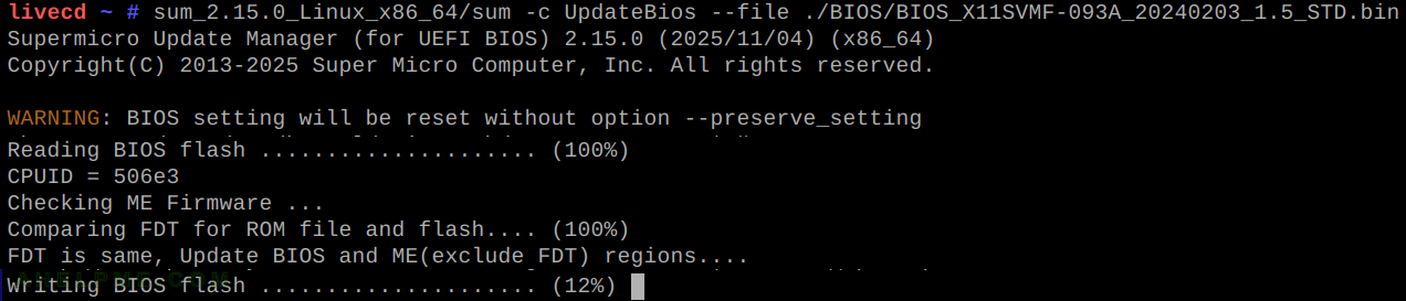 [root@srv1 sum_2.15.0_Linux_x86_64]# ./sum_2.15.0_Linux_x86_64/sum -c UpdateBios --file ./BIOS_X11SVMF-093A_20240203_1.5_STD.bin Supermicro Update Manager (for UEFI BIOS) 2.15.0 (2025/11/04) (x86_64) Copyright(C) 2013-2025 Super Micro Computer, Inc. All rights reserved. WARNING: BIOS setting will be reset without option --preserve_setting Reading BIOS flash ..................... (100%) CPUID = 506e3 Checking ME Firmware ... Comparing FDT for ROM file and flash.... (100%) FDT is same, Update BIOS and ME(exclude FDT) regions.... Writing BIOS flash ..................... (100%) Verifying BIOS flash ................... (100%) Checking ME Firmware ... Putting ME data to BIOS ................ (100%) Writing ME region in BIOS flash ... - Update skipped for FDR when ME is not in Manufacturing Mode!! BIOS update continues... - Updated Recovery Loader to OPRx - Updated FPT, MFSB, FTPR and MFS - ME Entire Image done WARNING:Must power cycle or restart the system for the changes to take effect! [root@srv1 sum_2.15.0_Linux_x86_64]# reboot